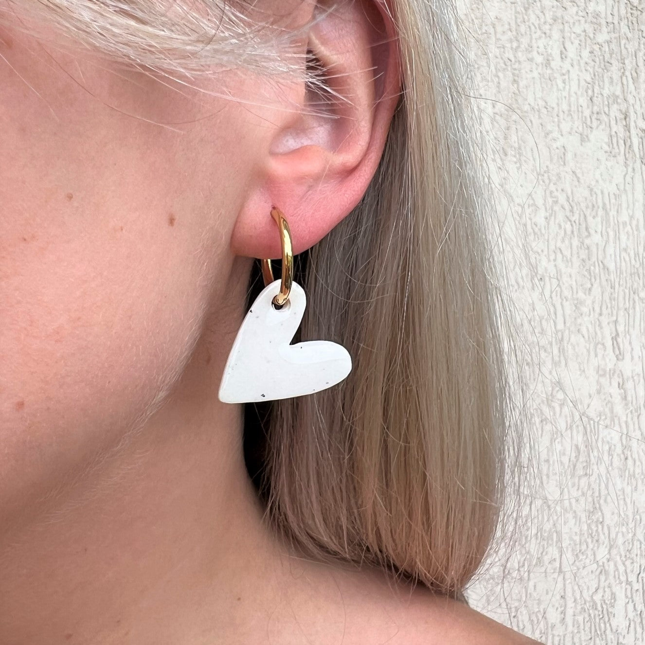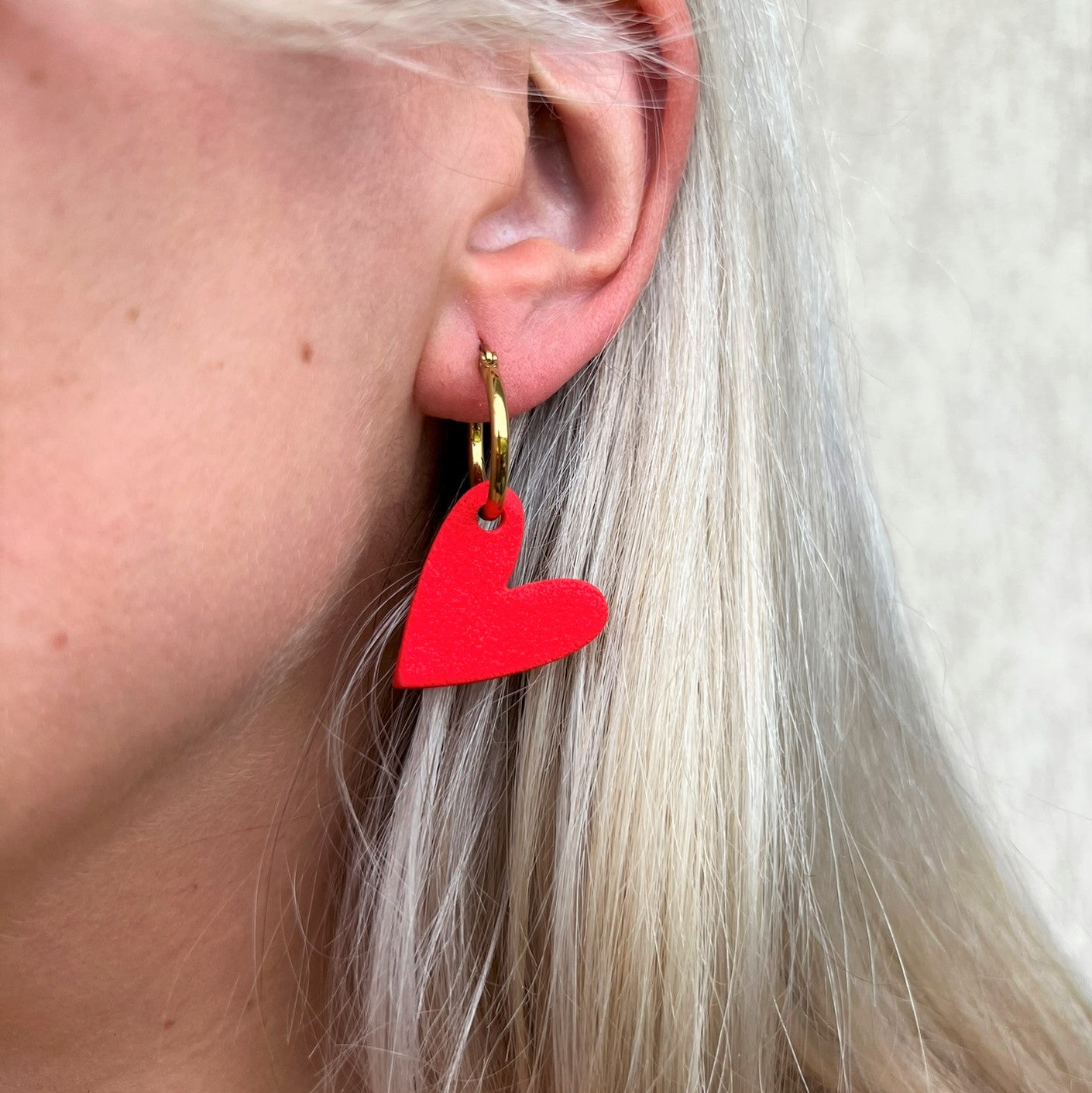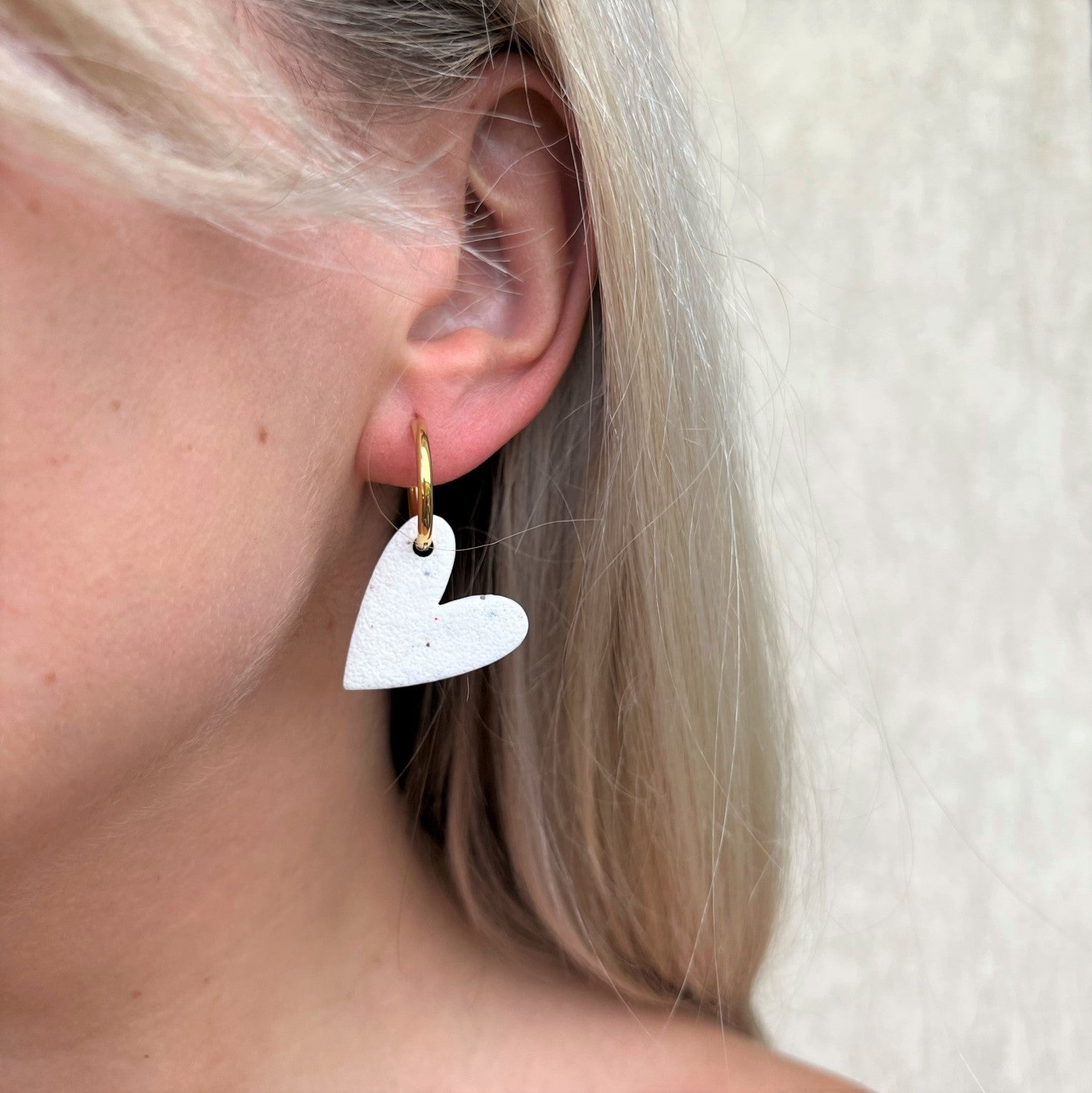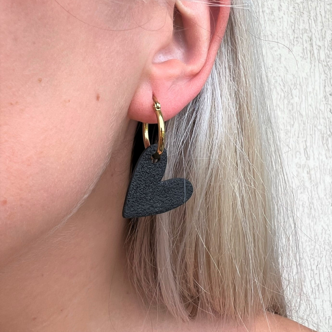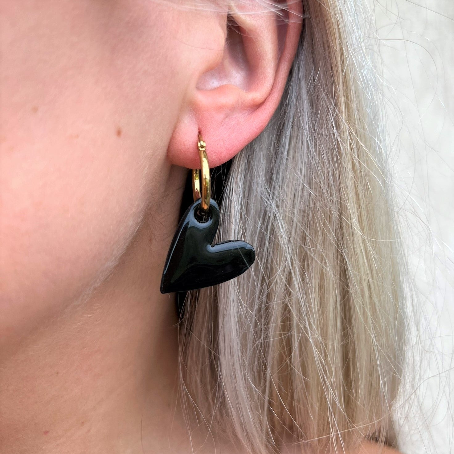 DITĖ auskarai gali būti nešiojami trimis būdais: tiesiog rinkutė (hoops), be širdelės papuošimo; matinė širdelė arba blizgi širdelė.