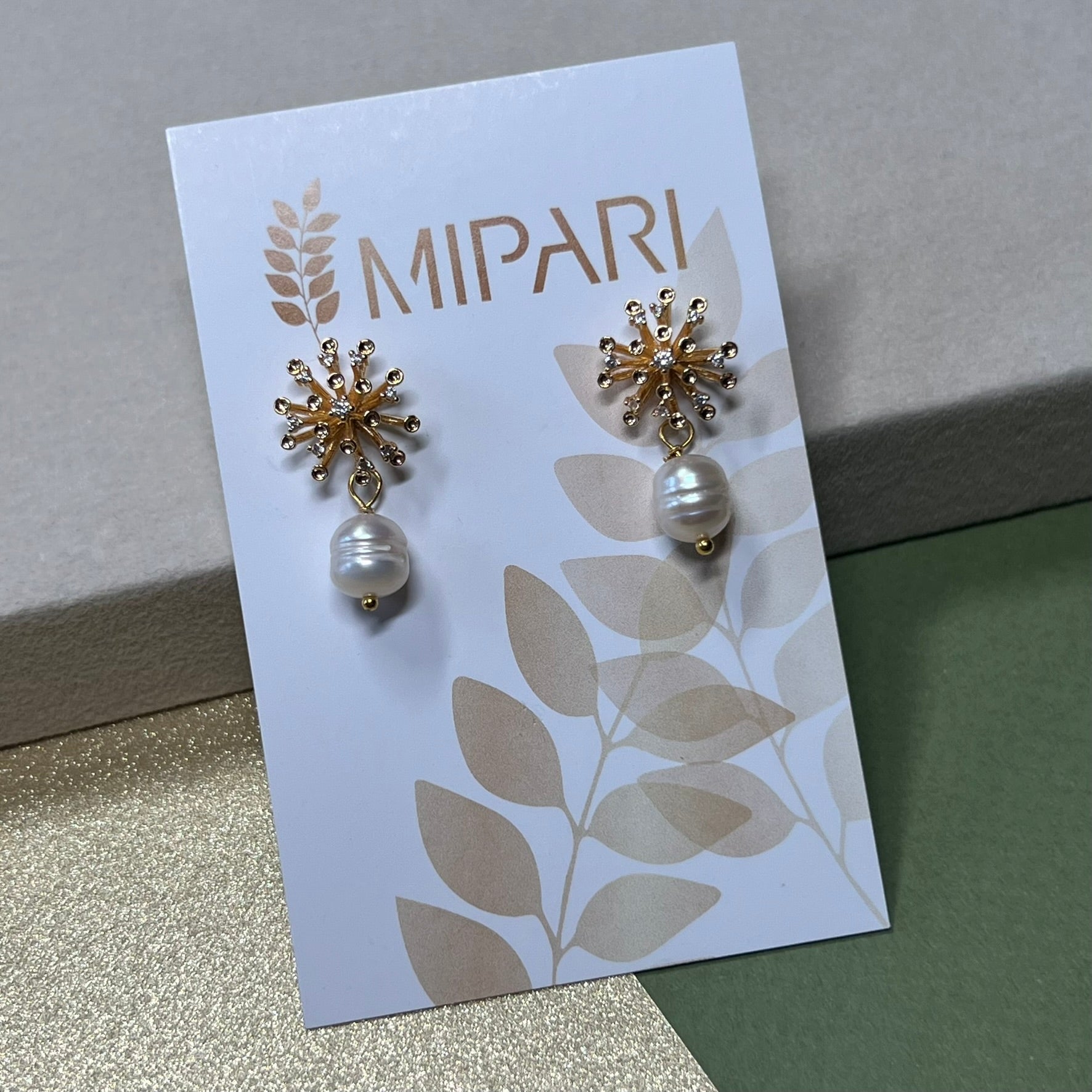Išskirtinės išvaizdos auskarai SAULĖ su upiniais perlais, dekoruoti mažomis cirkonio akutėmis, tad auskarams suteikia žaismingo žvilgesio.