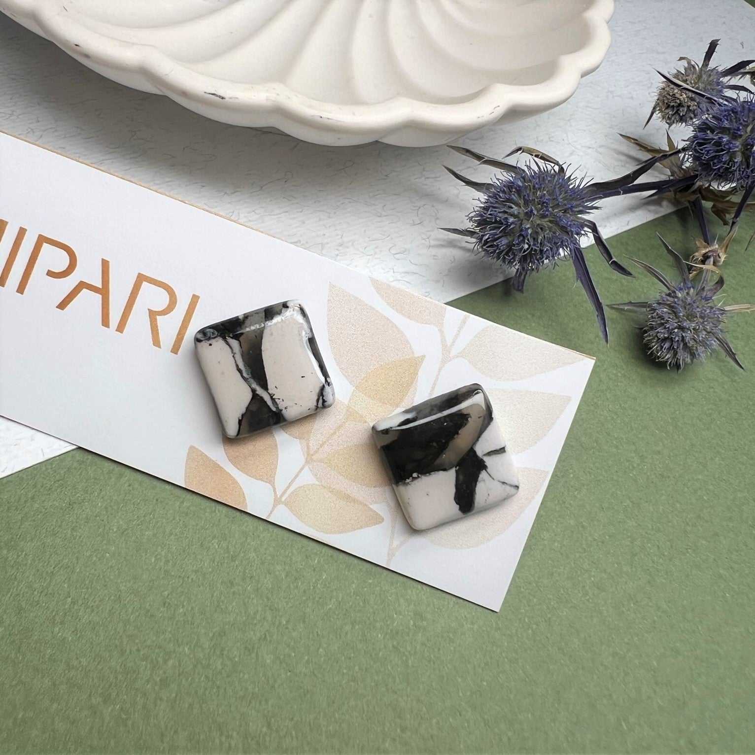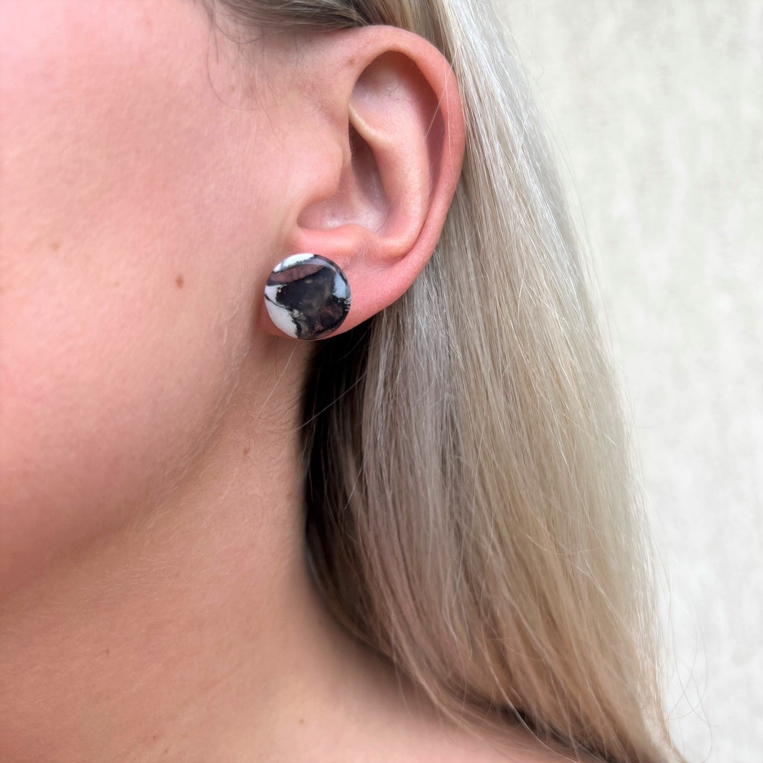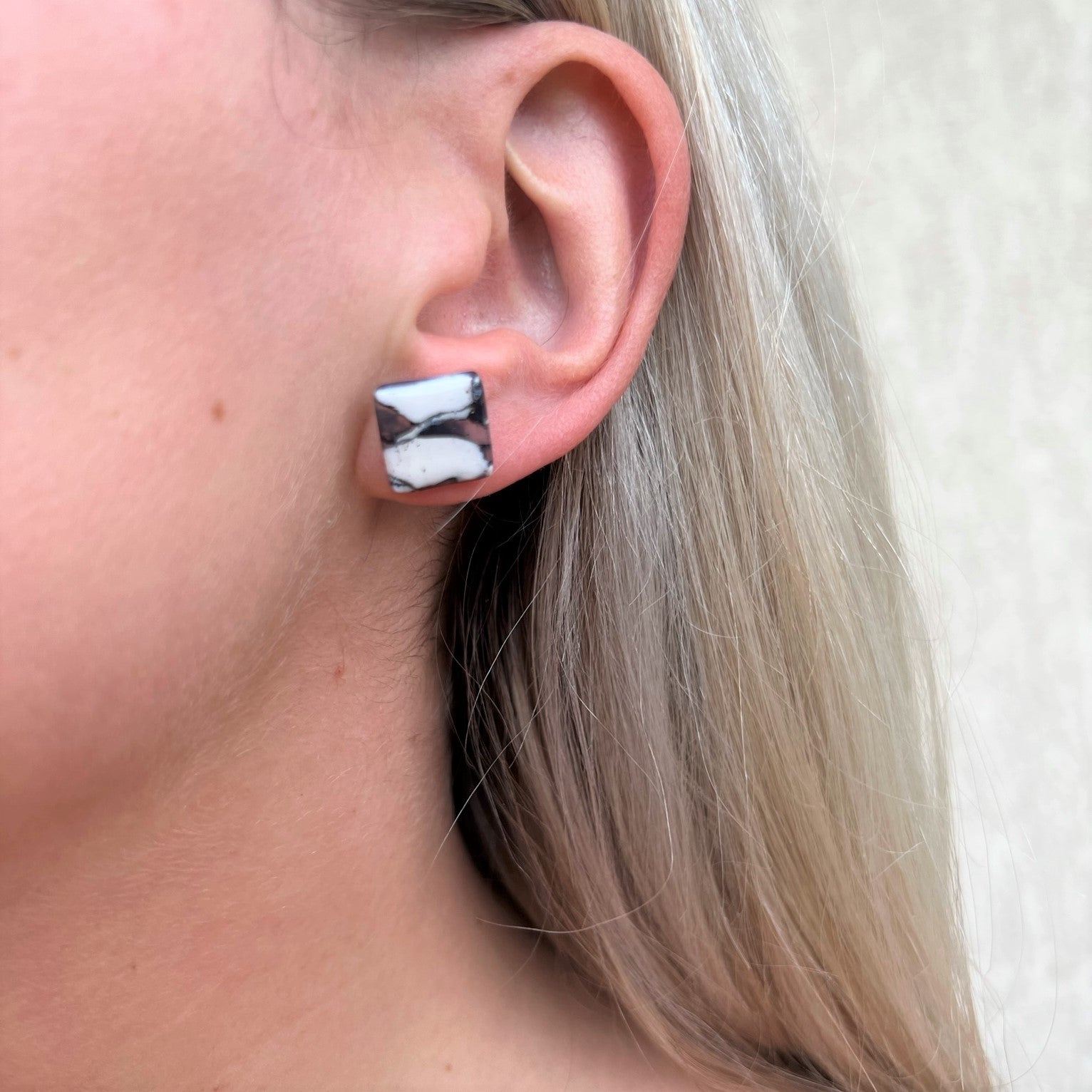 Tarsi marmūriniai, juodai balti minimalistiniai auskarai prie ausies.