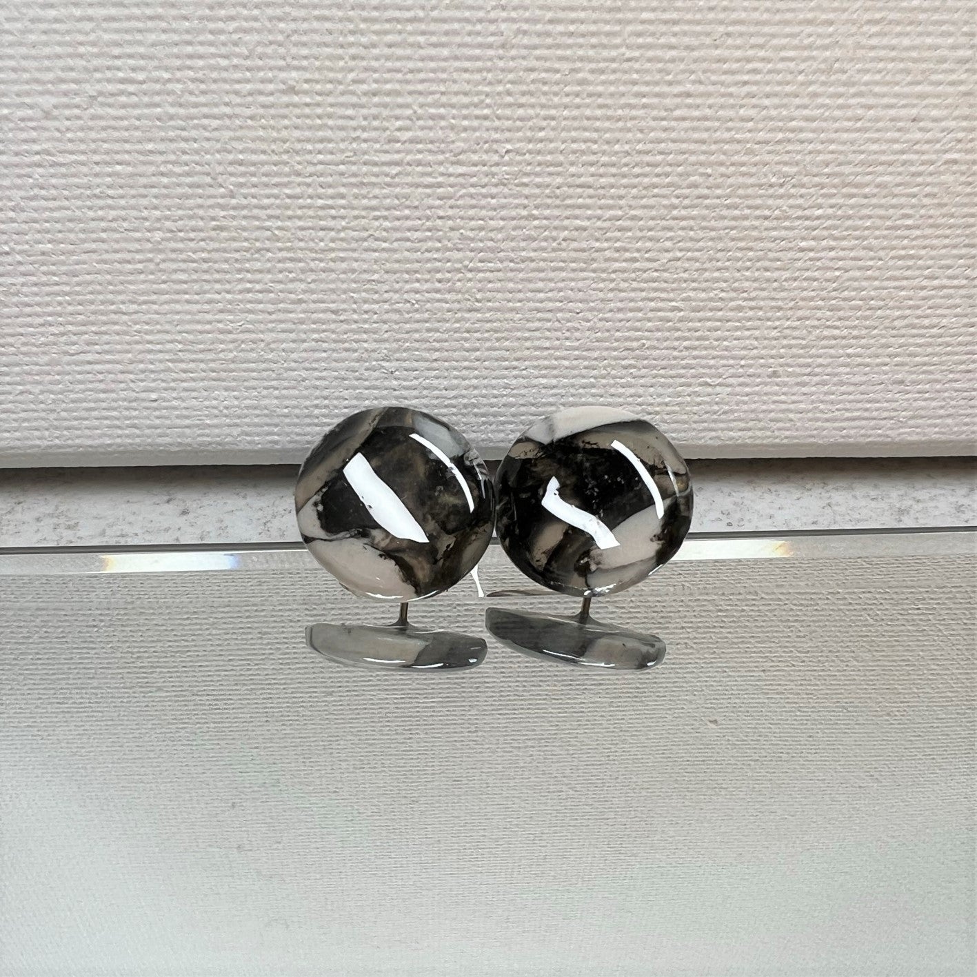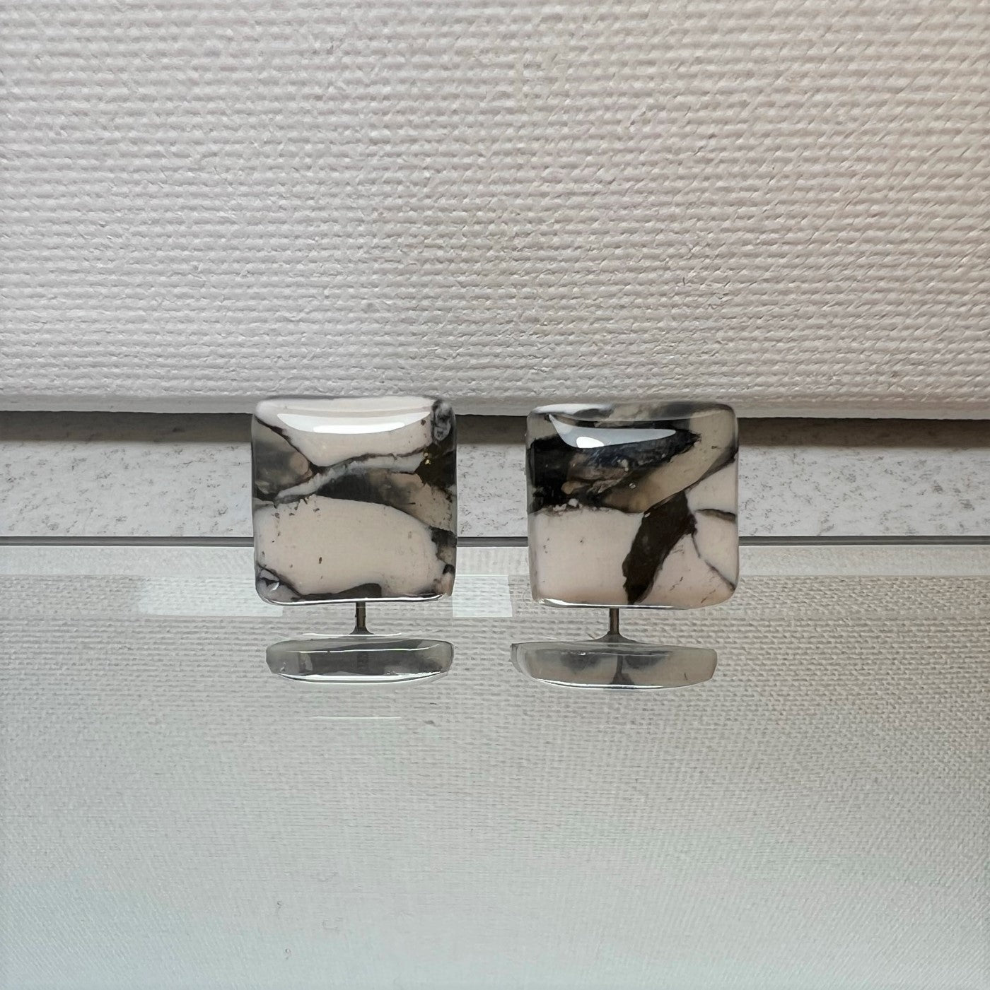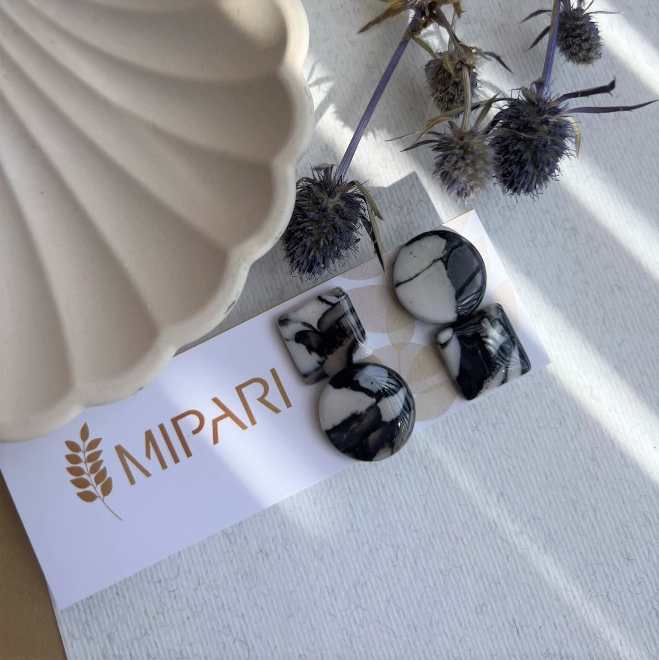 Tarsi marmūriniai, juodai balti minimalistiniai auskarai prie ausies.