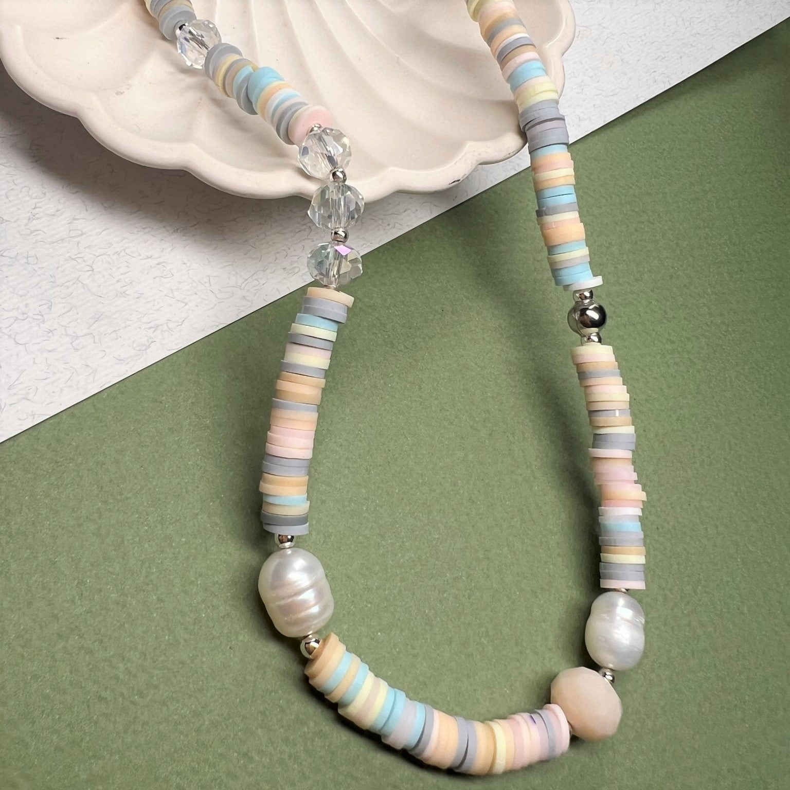 Švelnių spalvų polimerinio molio vėrinys, kuris tiks prie visko.