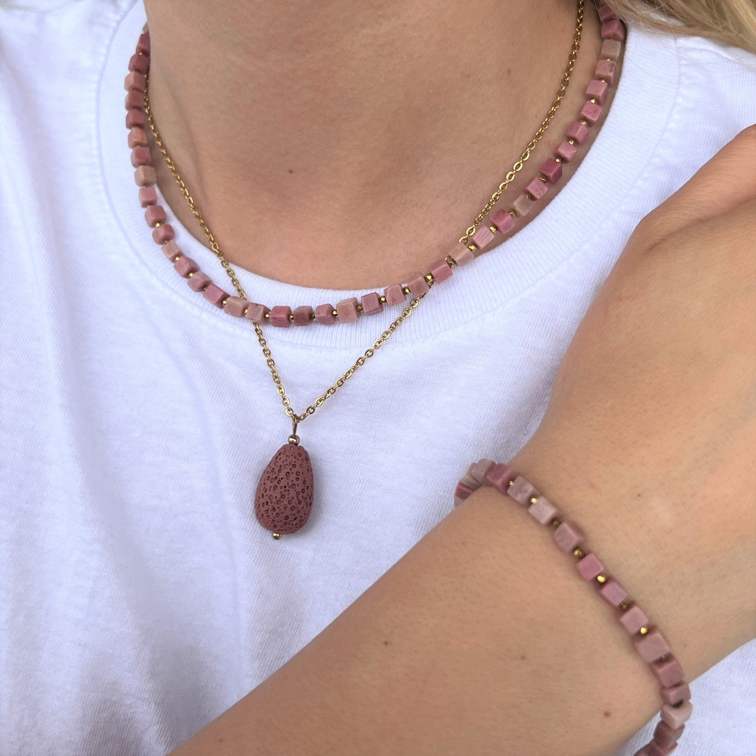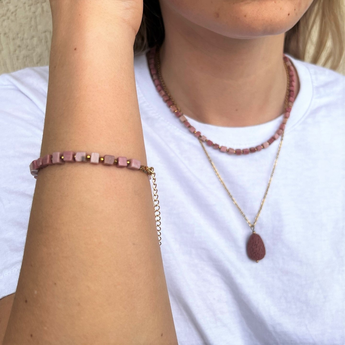 Klasikinę rodonito apyrankę pagyvina kiek neįprasta karoliukų forma - kvadratėliai. Ši apyrankė tiks tiek prie klasikinio, tiek prie įmantraus stiliaus drabužių.