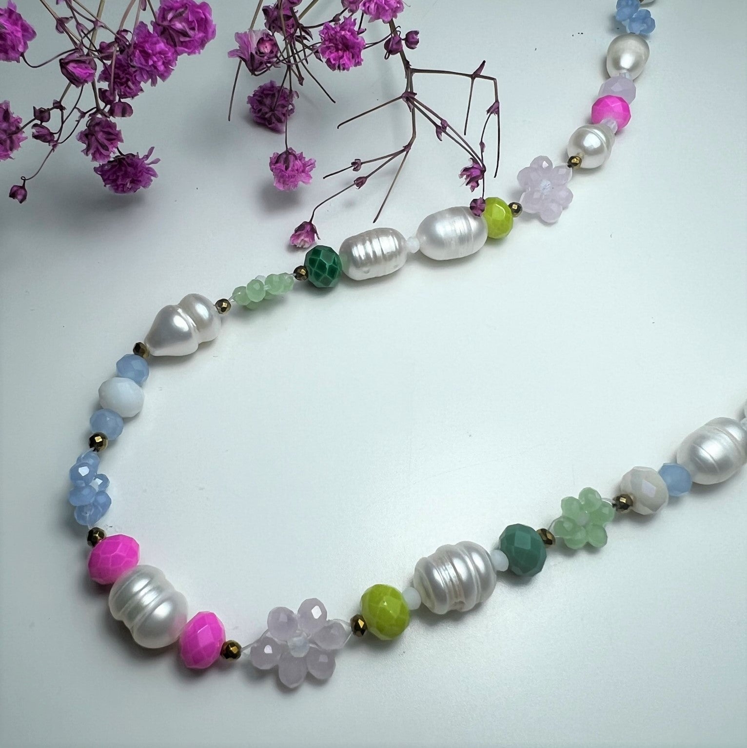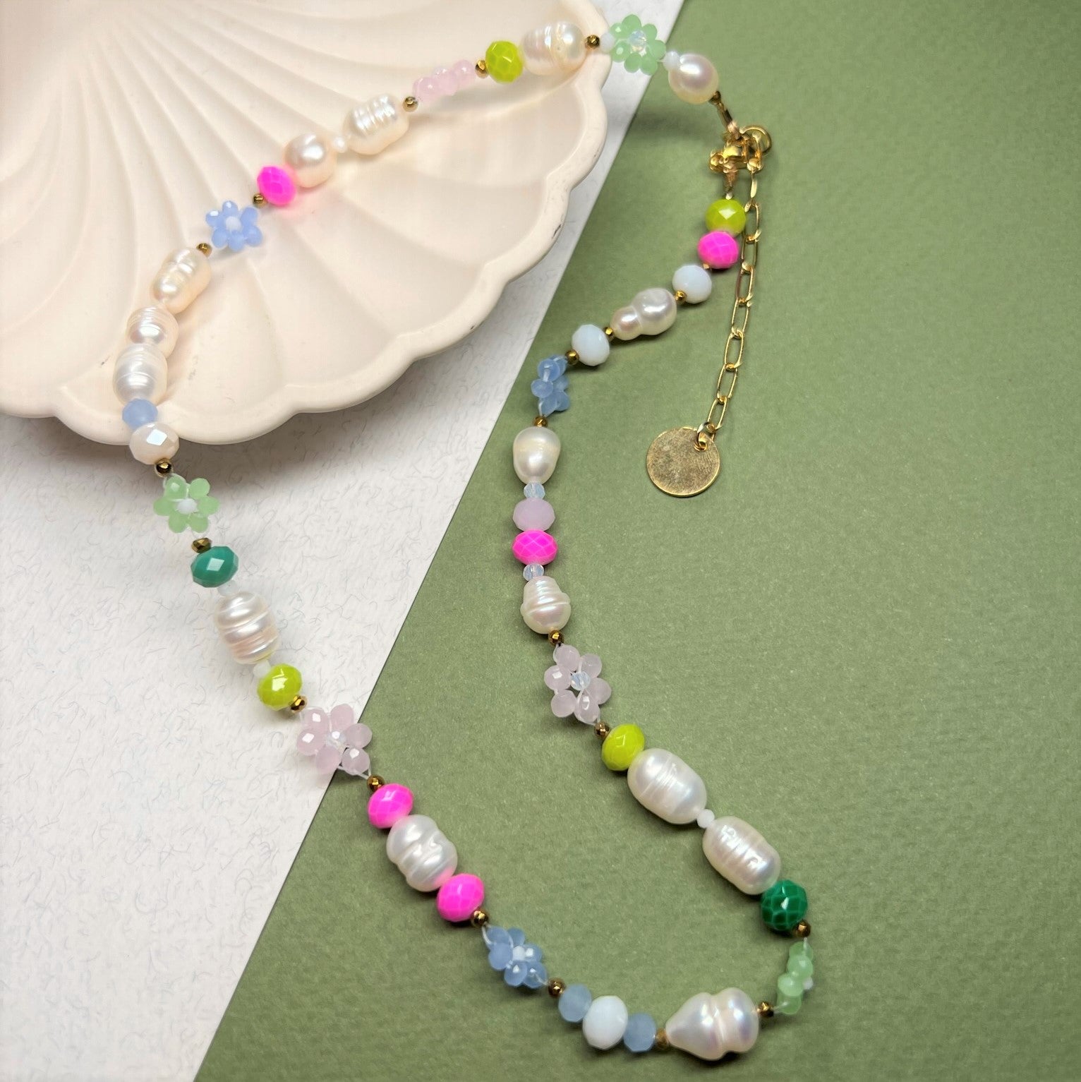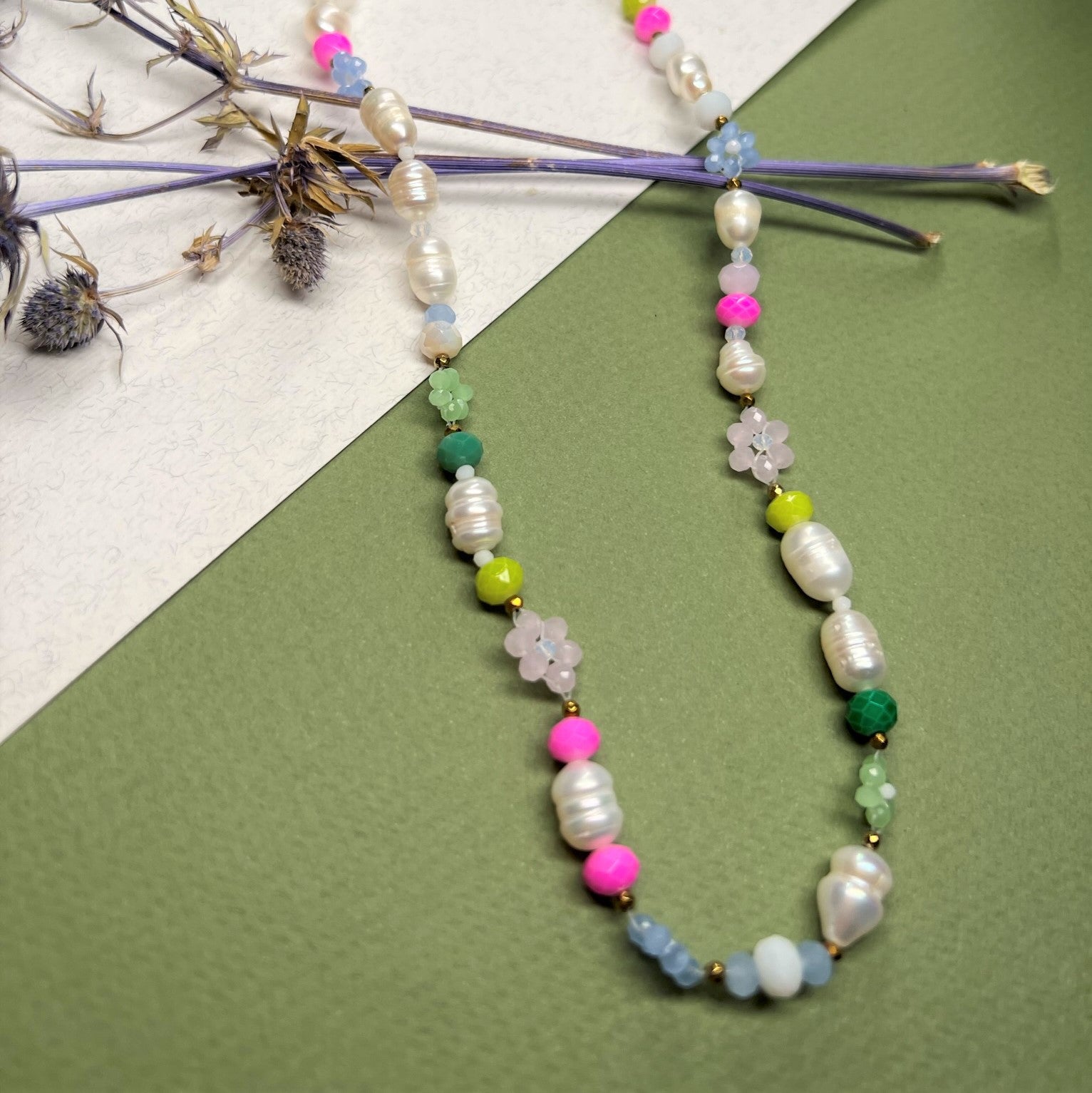 Pievose yra kažkas ypatingo ir įdomaus. Ji atveria mums duris į gamtos pasaulį, kuris sužavi savo grožiu ir ramybe. Taip pat ir šis perlų vėrinys - ypatingis ir įdomus, puikiai tiks norinčioms pasipuošti ir paįvairinti klasikinį perlų vėrinį žaismingomis gėlytėmis bei spalvomis.