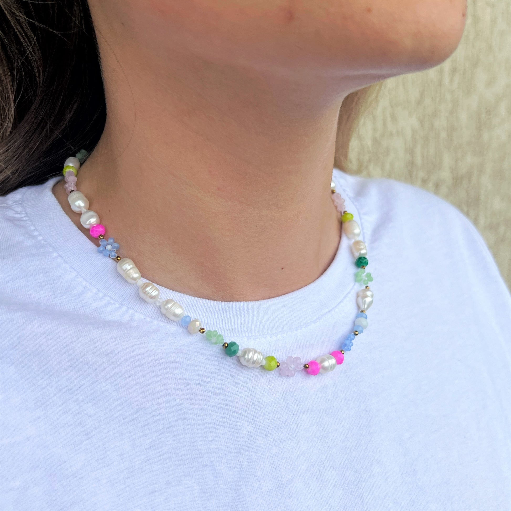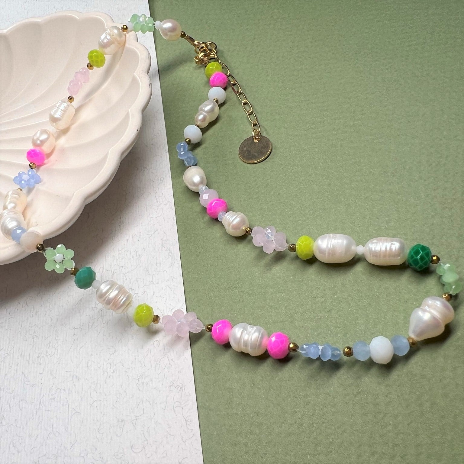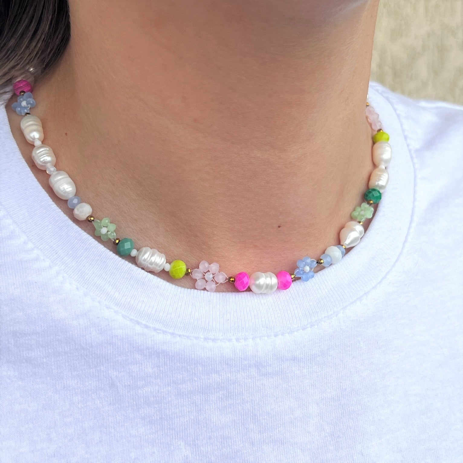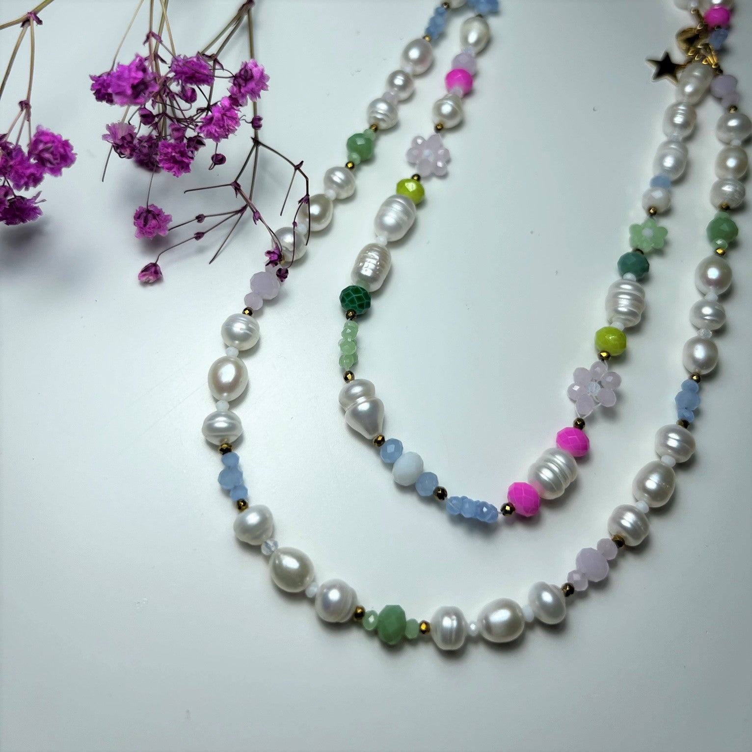 Pievose yra kažkas ypatingo ir įdomaus. Ji atveria mums duris į gamtos pasaulį, kuris sužavi savo grožiu ir ramybe. Taip pat ir šis perlų vėrinys - ypatingis ir įdomus, puikiai tiks norinčioms pasipuošti ir paįvairinti klasikinį perlų vėrinį žaismingomis gėlytėmis bei spalvomis.